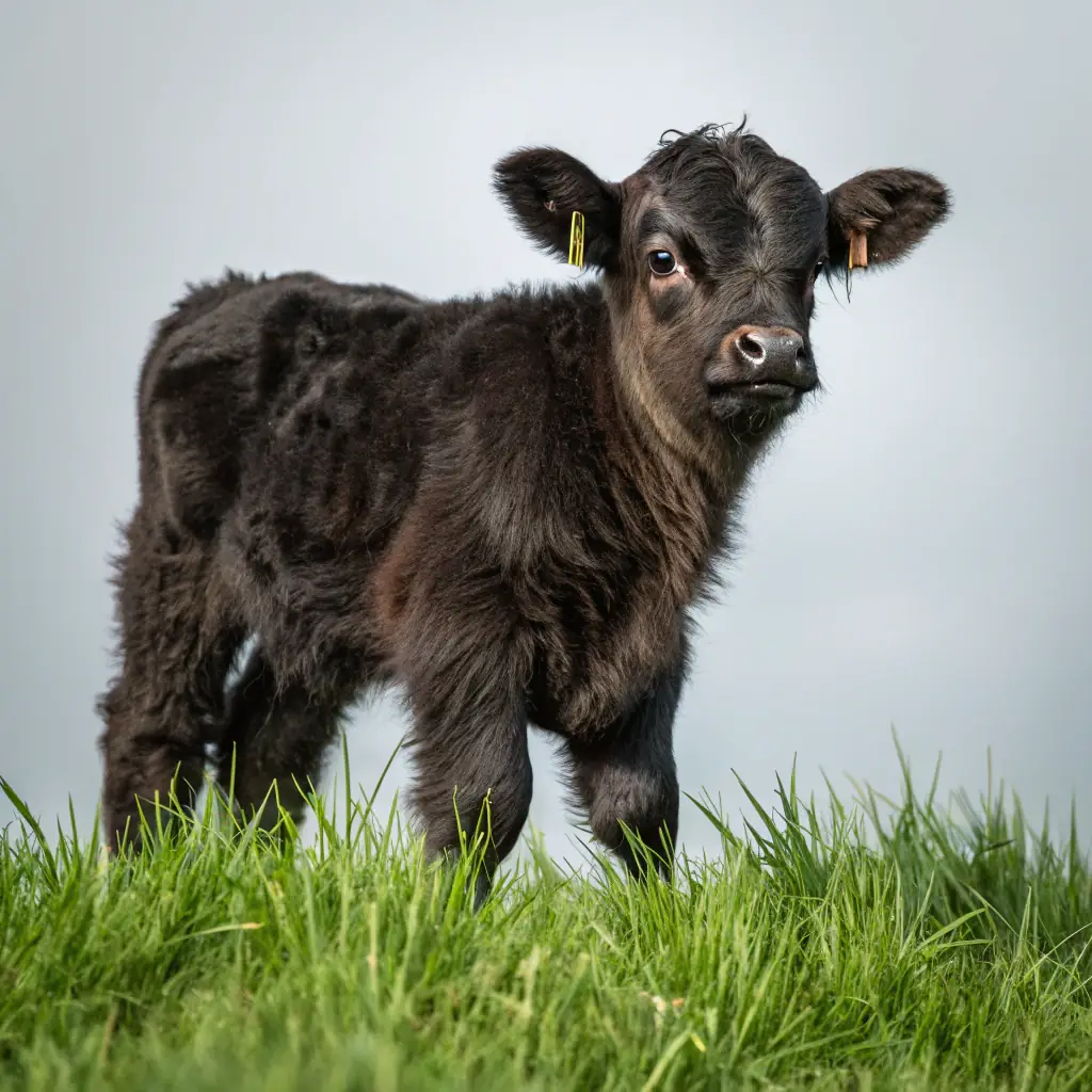 This sleek mini highland calf boasts a shiny black coat and a compact, muscular frame. Its friendly expression and manageable size make it an excellent pet or farm animal. The calf’s distinctive look and gentle nature make it a favorite among animal lovers. Perfect for small farms, petting zoos, or as a charming companion piece.